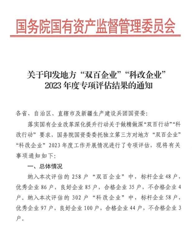 據(jù)了解,“科改企業(yè)”專項評估每年進行一次,旨在落實國有企業(yè)改革深化提升行動關(guān)于做精做深“科改行動”要求。本次國務院國資委委托獨立第三方對地方“科改企業(yè)”2023年度工作開展情況進行了專項評估,考核結(jié)果按照得分高低分為標桿、優(yōu)秀、良好、合格、不合格五個等級,考核內(nèi)容涉及企業(yè)科技創(chuàng)新、體制機制、綜合成效等方面共計47項指標,全面權(quán)威地反應了企業(yè)在加快科技新成果轉(zhuǎn)化、提升自主創(chuàng)新能力等方面的舉措和成果。
