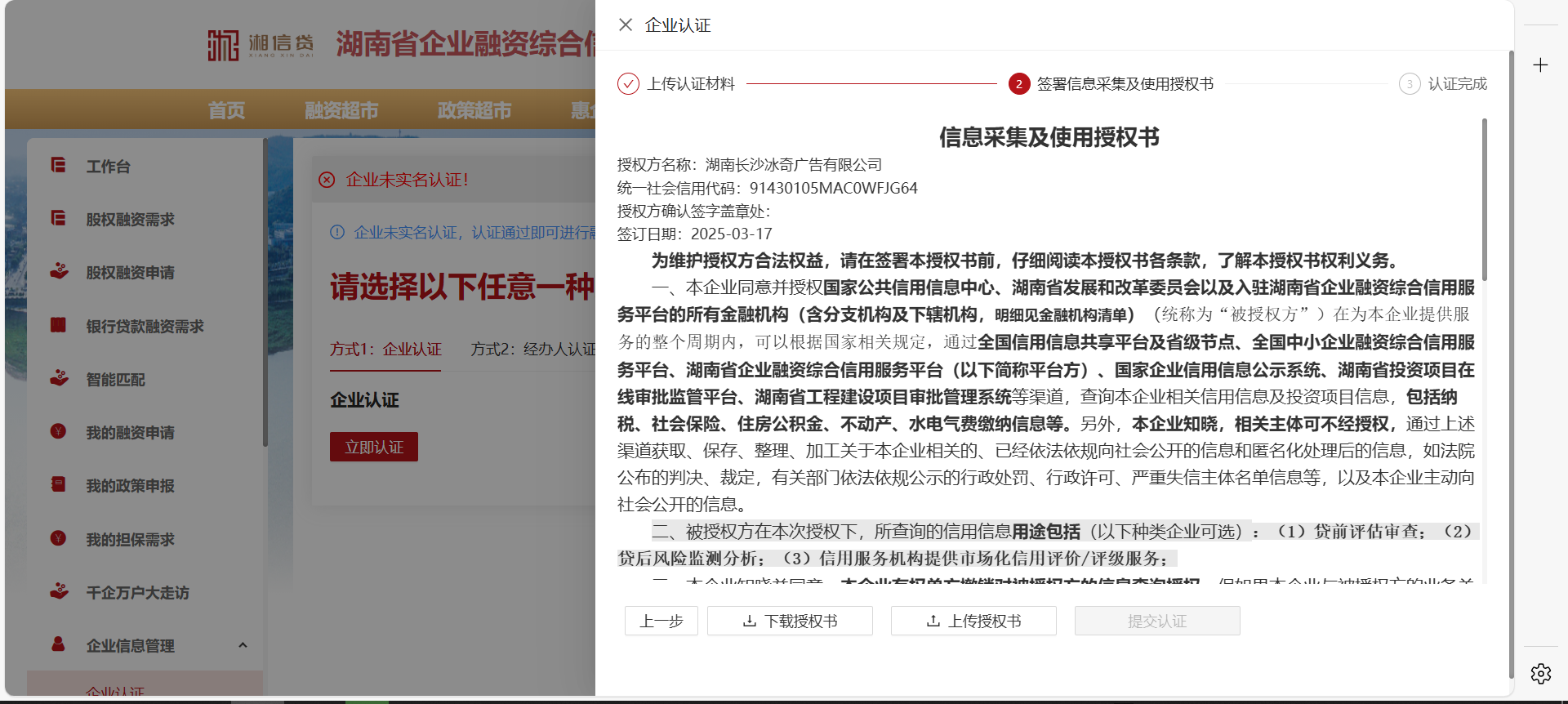 5、在完成企業(yè)認證后,進行企業(yè)信息采集使用授權(quán)書簽署上傳,允許平臺查詢企業(yè)相關基礎信息、納稅欠稅、不動產(chǎn)、水電氣繳費信息情況。