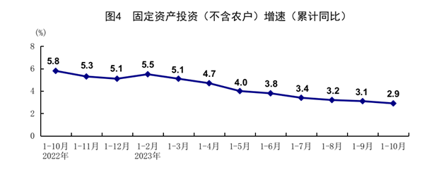 1-10月份,全國(guó)固定資產(chǎn)投資(不含農(nóng)戶)419409億元,同比增長(zhǎng)2.9%,比1-9月份回落0.2個(gè)百分點(diǎn)。分領(lǐng)域看,基礎(chǔ)設(shè)施投資同比增長(zhǎng)5.9%,制造業(yè)投資增長(zhǎng)6.2%,房地產(chǎn)開(kāi)發(fā)投資下降9.3%。全國(guó)商品房銷售面積92579萬(wàn)平方米,同比下降7.8%;商品房銷售額97161億元,下降4.9%。分產(chǎn)業(yè)看,第一產(chǎn)業(yè)投資同比下降1.3%,第二產(chǎn)業(yè)投資增長(zhǎng)9.0%,第三產(chǎn)業(yè)投資增長(zhǎng)0.4%。民間投資下降0.5%,降幅比1-9月份收窄0.1個(gè)百分點(diǎn);扣除房地產(chǎn)開(kāi)發(fā)投資,民間投資同比增長(zhǎng)9.1%。高技術(shù)產(chǎn)業(yè)投資同比增長(zhǎng)11.1%,其中高技術(shù)制造業(yè)和高技術(shù)服務(wù)業(yè)投資分別增長(zhǎng)11.3%、10.5%。高技術(shù)制造業(yè)中,航空、航天器及設(shè)備制造業(yè),醫(yī)療儀器設(shè)備及儀器儀表制造業(yè)投資分別增長(zhǎng)19.0%、16.7%;高技術(shù)服務(wù)業(yè)中,科技成果轉(zhuǎn)化服務(wù)業(yè)、專業(yè)技術(shù)服務(wù)業(yè)投資分別增長(zhǎng)37.3%、29.1%。10月份,固定資產(chǎn)投資(不含農(nóng)戶)環(huán)比增長(zhǎng)0.10%。