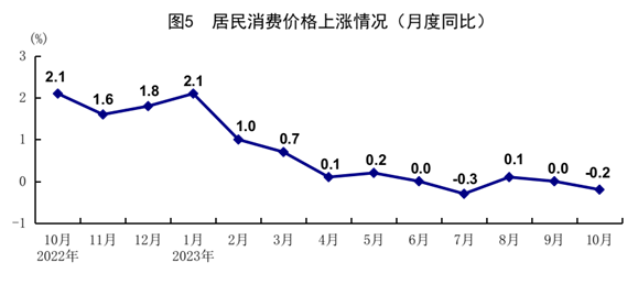 10月份,全國(guó)居民消費(fèi)價(jià)格(CPI)同比下降0.2%,環(huán)比下降0.1%。分類別看,食品煙酒價(jià)格同比下降2.1%,衣著價(jià)格上漲1.1%,居住價(jià)格上漲0.3%,生活用品及服務(wù)價(jià)格下降0.6%,交通通信價(jià)格下降0.9%,教育文化娛樂(lè)價(jià)格上漲2.3%,醫(yī)療保健價(jià)格上漲1.3%,其他用品及服務(wù)價(jià)格上漲3.6%。在食品煙酒價(jià)格中,豬肉價(jià)格下降30.1%,鮮菜價(jià)格下降3.8%,糧食價(jià)格上漲0.6%,鮮果價(jià)格上漲2.2%??鄢称泛湍茉磧r(jià)格后的核心CPI同比上漲0.6%。1-10月份,全國(guó)居民消費(fèi)價(jià)格同比上漲0.4%。